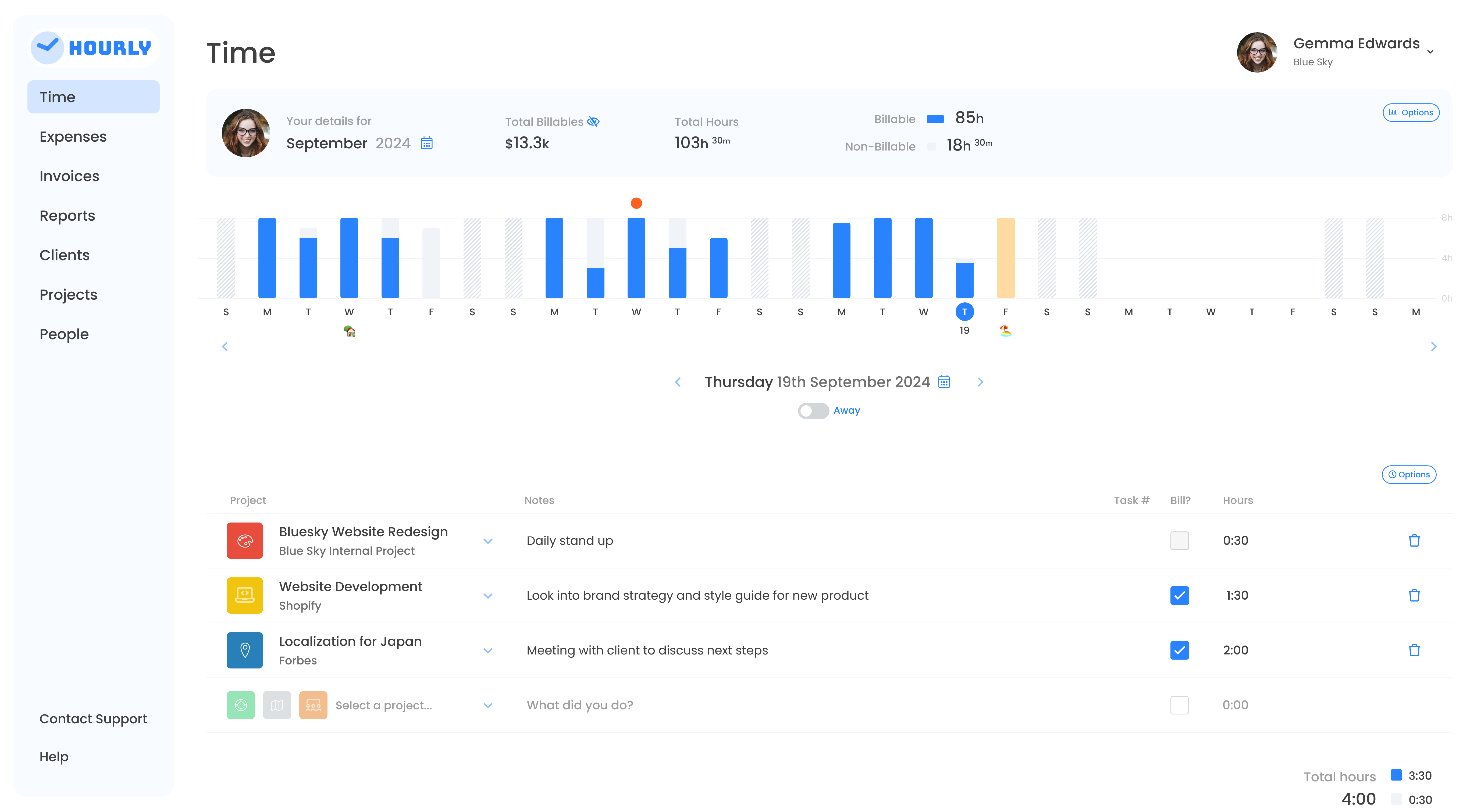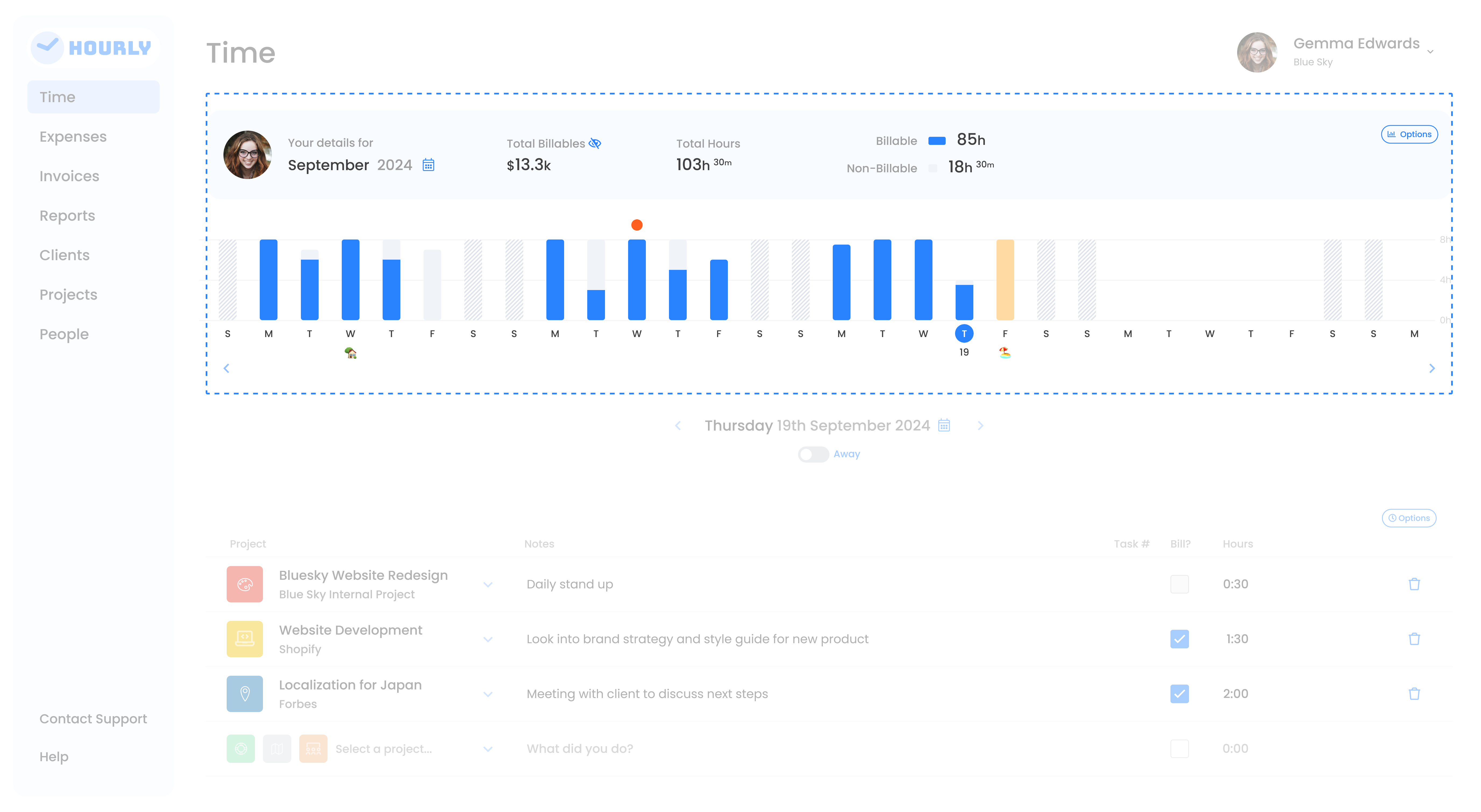 We've put the summary bar and time chart up the top of the time page so you can see how you're tracking for any given week or month (you can switch between the two in the options drop-down in the top right and select the time period next to your avatar on the left).